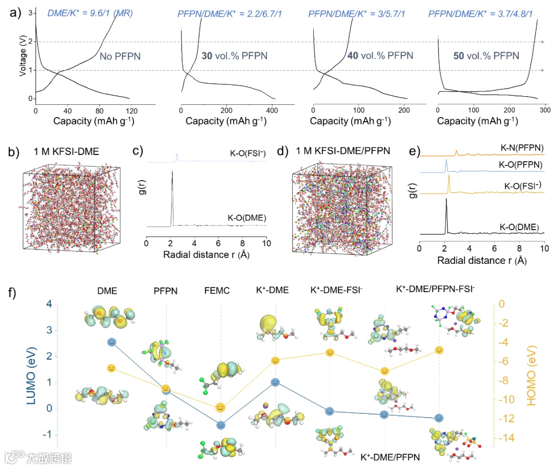 图2. (a) 石墨负极在1 M DME中不同含量的PFPN(1 M KFSI-DME,1 M KFSI-DME/30 vol % FPPN, 1 M KFSI-DME/40 vol % FPPN,1 M KFSI-DME/50 vol % FPPN);(b) 1 M KFSI-DME溶剂化结构的MD模拟。(c)1 M KFSI-DME的径向分布函数;(d) 1 M KFSI-DME/PFPN溶剂化结构的MD模拟;(e) 1 M KFSI-DME/PFPN的径向分布函数;(e) SA-GO粘结剂的SEM图;(f) 各种溶剂和聚集体的HOMO和LUMO能级对比。