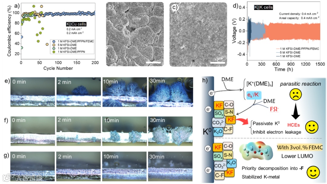 图5. 钾金属与电解液的兼容性。(a) K||Cu电池的库伦效率对比;(b) 5 M KFSI-DME电解液和(c)1 M KFSI-DME/PFPN/FEMC电解液中的K沉积后的Cu的SEM图;(d)K||K对称电池的循环性能;(e)1 M KFSI-DME,(e)1 M KFSI-DME和(g)1 M KFSI-DME/PFPN/FEMC电解液中的原位枝晶观测(电流密度:0.6 mA cm-2);(h)DME基电解液中FEMC调节的K金属抗腐蚀机制。
