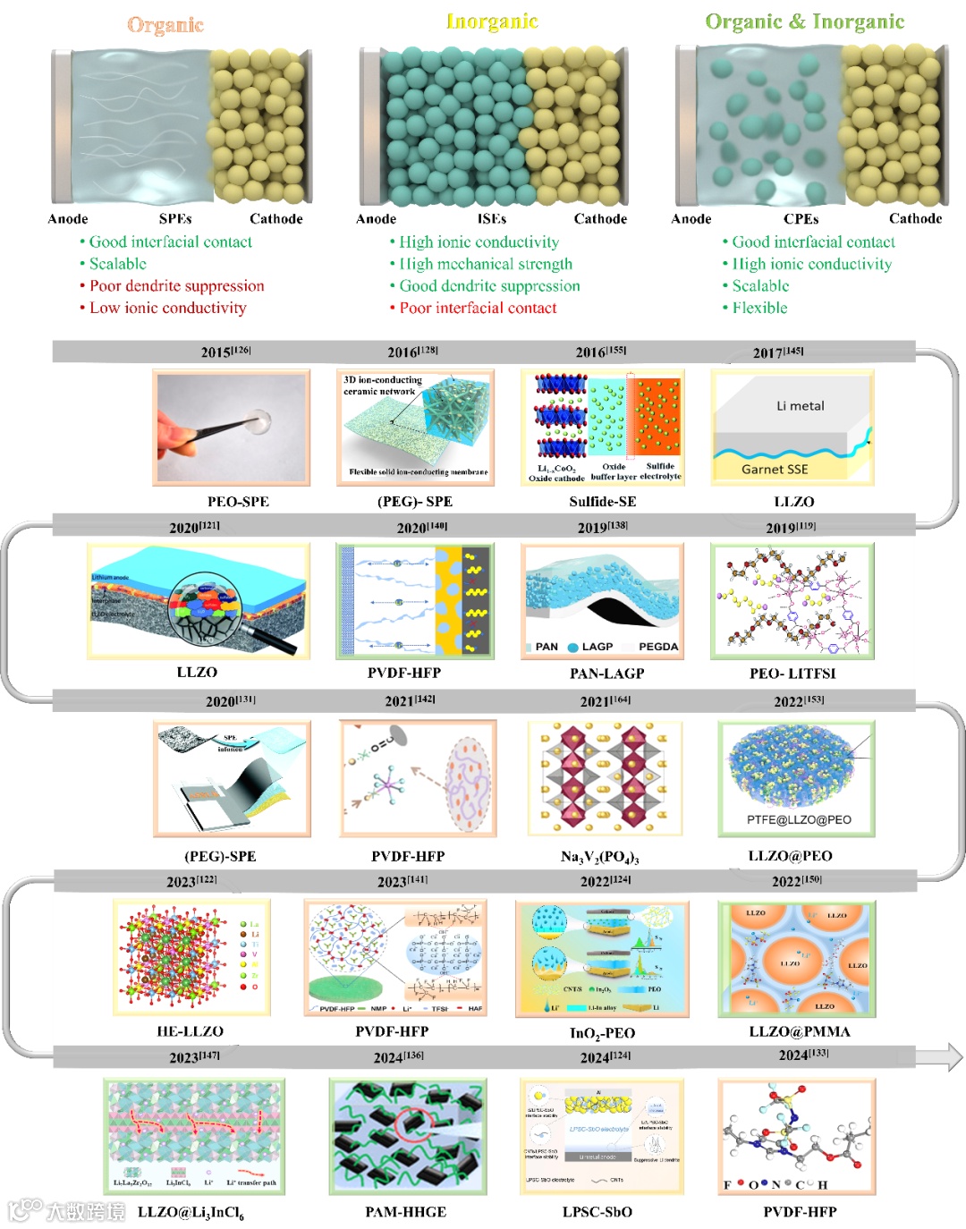 在SSMSBs中,固态电解质的选择需综合考虑其与电极材料的相容性、力学特性及电化学稳定性。有机聚合物电解质(如PEO基体系)具有良好的界面接触和加工性能,但其较低的剪切模量难以有效抑制锂枝晶生长,且与锂金属间持续的界面副反应导致容量衰减。无机固态电解质(如硫化物、氧化物)虽具备较高的离子电导率和机械强度,却往往面临与电极之间严重的界面反应和物理接触问题。为此,复合固态电解质(如聚合物-陶瓷复合体系)逐渐成为研究热点,它既通过陶瓷填料提升整体模量和离子电导率,又可借助聚合物基质改善界面相容性和柔性成膜能力。常见策略还包括引入功能性中间层以阻断副反应、调控电极–电解质界面以形成稳定SEI等,从而协同提升电池的综合电化学性能与安全性。