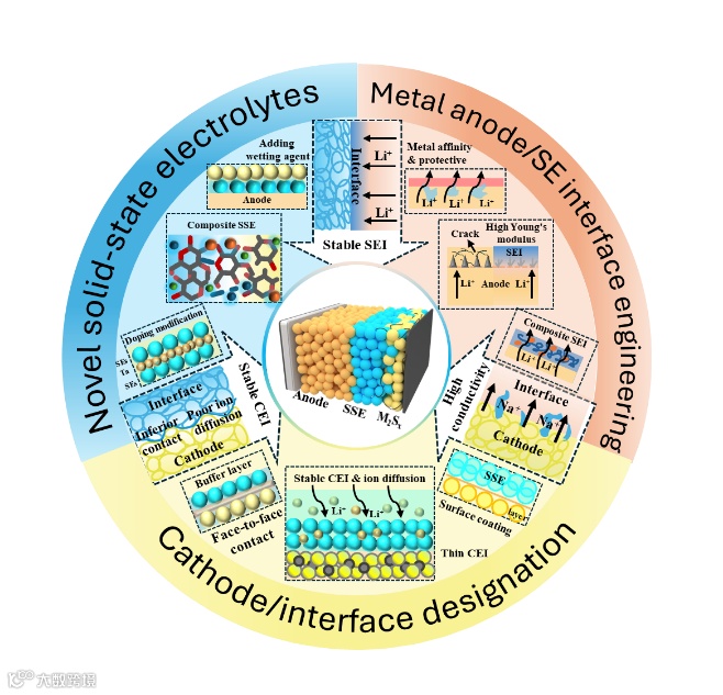 针对正极/SSE界面,优化策略主要包括:(1)构建共形界面,通过原子层沉积(ALD)等技术在正极颗粒表面包覆均匀纳米层,以增强界面接触并抑制副反应;(2)设计混合界面,结合聚合物与无机电解质的优势,在界面处形成柔-刚复合结构,改善界面相容性和应力适应能力;(3)引入保护涂层,如LiNbO3、LiTaO3等快离子导体涂层,阻断正极与电解质之间的有害相互扩散;(4)调控空间电荷层,抑制因离子化学势差异导致的界面离子耗尽/富集现象,降低界面阻抗;(5)构建固态电解质-正极混合复合界面,通过将电解质材料集成至正极内部,扩展离子传输通道,提升界面离子传输效率。而对于负极/SSE界面,主要优化策略集中于构建人工界面层(AIL),例如在锂金属表面引入LiF、Li₃N、LiPON等高离子电导且机械稳定的界面层,以有效抑制锂枝晶穿刺并增强界面离子传输,提升电池的循环寿命和安全性能。