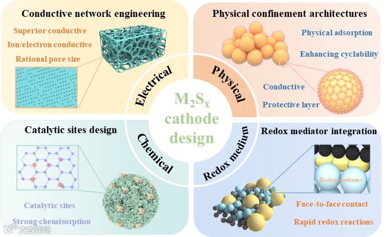 M2Sx正极作为基于M2Sx的SSMSBs的关键部分,其合理的设计是实现高比能SSMSBs的前提。然而,M2Sx正极具有与单质硫正极类似的固有挑战,主要特征是低电子导电性和多硫化物穿梭效应。为了解决这些限制,研究人员广泛采用了硫正极的设计原则(图2),包括 (1)导电网络工程,(2)物理限域结构,(3)催化位点设计,(4)氧化还原介质集成。此外,在优化用于SSMSBs的M2Sx正极时,与液体或凝胶态系统的设计原则相比,最重要的是要注意:(1)有效地建立和稳定固-固界面,(2)减轻体积变化对刚性结构的破坏性影响,(3)确保固体复合正极内长期连续的离子/电子传导途径。