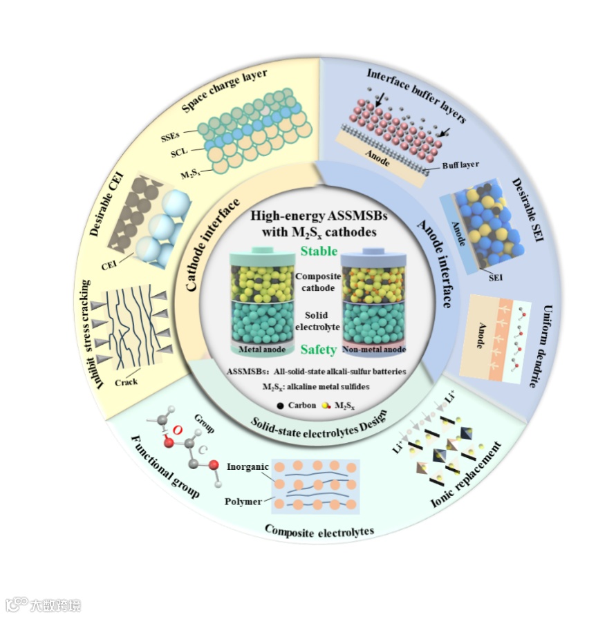 近日,来自湘潭大学的马增胜教授,上海理工大学的王云晓教授,与悉尼科技大学的赵铃飞博士和汪国秀教授合作,在国际知名期刊Advanced Energy Materials上发表题为“Challenges and Prospects of Alkali Metal Sulfide Cathodes toward Advanced Solid-State Metal-Sulfur Batteries”的观点文章。该观点文章就SSMSBs的反应机理及降低M2Sx初始活化屏障的有效策略进行综述,全面讨论了SSMSBs中常用的一系列固态电解质和添加剂。此外,该文章还探讨了SSMSBs的界面反应和相关挑战,并总结了构建良好界面接触的有希望的解决方案(图1)。