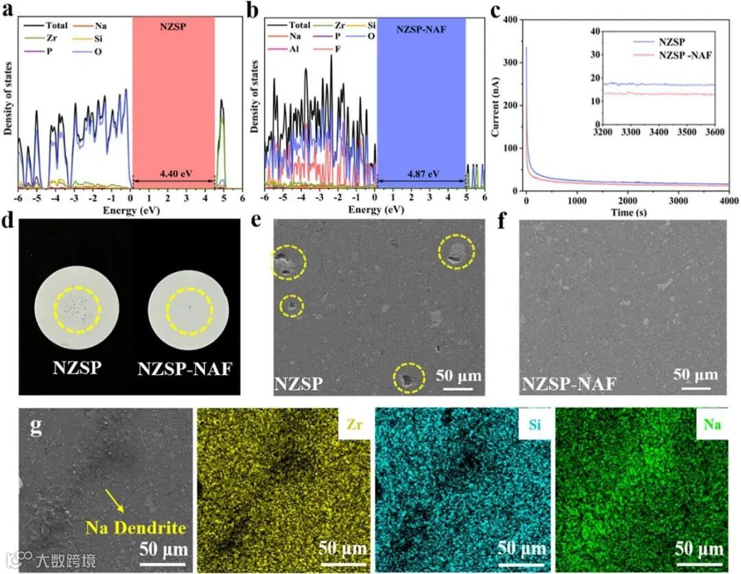 NAF的填充使钠离子在晶界区域的迁移能垒从 0.39-0.51 eV 降至 0.27-0.38 eV,加速离子传输。同时拓宽电解质带隙,电子电导率降至 9.33×10⁻⁹ S・cm⁻¹,抑制钠离子在晶界还原沉积。