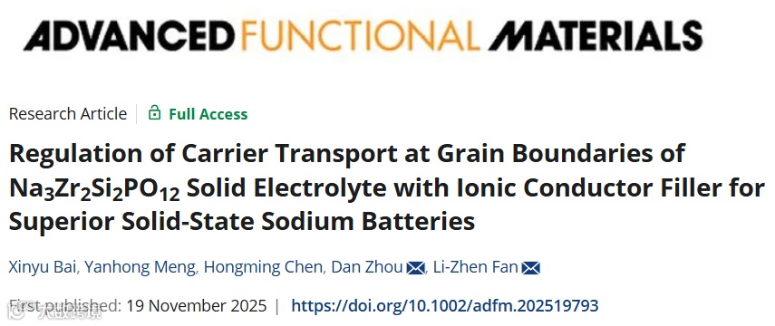 近日,北京科技大学周丹团队在国际知名期刊《Advanced Functional Materials》上发表题为“Regulation of Carrier Transport at Grain Boundaries of Na₃Zr₂Si₂PO₁₂ Solid Electrolyte with Ionic Conductor Filler for Superior Solid-State Sodium Batteries”的研究论文。该工作创新性地引入离子导体Na₃AlF₆(NAF)作为晶界填料,构建三维离子传输网络,显著提升了NZSP电解质的离子电导率与抗枝晶能力,实现了固态钠电池的超长循环稳定性。