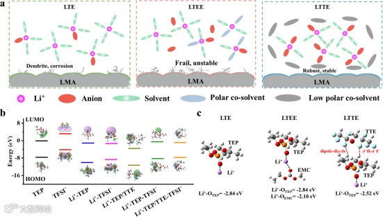 图1. LCE的设计:(a)Li+溶剂化结构模型和不同电解液体系中SEI的形成。(b)各种溶剂、TFSI-阴离子、Li+-溶剂/或Li+溶剂-阴离子络合物的前沿分子轨道能级(HOMO和LUMO)(插图是HOMO和LUMO的模拟快照)。(c)Li+与不同溶剂(TEP、EMC和TTE)之间不同相互作用的示意图。