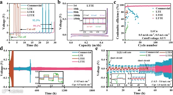 图4. 不同电解液中的锂镀/剥离行为:(a)不同电解液中Li||Cu电池的库仑效率。(b)LTTE中Cu工作电极上镀/剥离锂的电压分布,插图显示了放大的视图区域。(c)在使用不同电解液的Li||Cu电池中长循环的库仑效率。(d)使用不同电解液的对称Li||Li电池的恒电流循环,插图是电压分布的放大图。(e)使用不同电解液的Li||Li对称电池的倍率性能,插图是电压曲线的放大倍数。