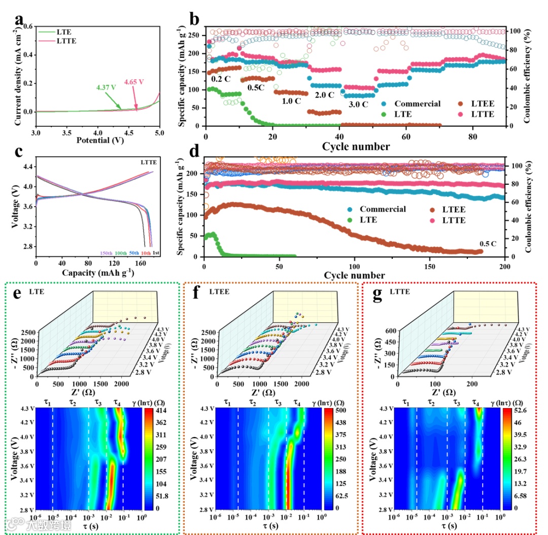 图6. 使用不同电解液的Li||NCM622全电池的电化学行为:(a)不同电解液的线性扫描伏安(LSV)曲线。(b)Li||NCM622电池在不同电解液中的倍率性能。(c)使用LTTE的Li||NCM622电池的典型充电/放电曲线。(d)Li||NCM622电池在不同电解液中在0.5 C下的循环稳定性。(e)LTE、(f)LTEE和(g)LTTE中Li||NCM622电池的原位EIS和DRT结果。