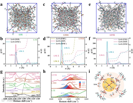 图2. 不同电解液中溶剂化结构的表征:(a)LTE、(c)LTEE和(e)LTTE的AIMD快照。(b)LTE、(d)LTEE、(f)LTTE的径向分布函数(RDF)和相应的配位数(N(r))。(g)不同电解液的拉曼光谱。(h)不同电解液特征峰的拉曼光谱。(i)溶剂化结构示意图。