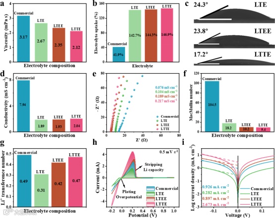 通过对不同电解液的粘度、电导率以及接触角测试表明,与使用1 M LiPF6的商业电解液相比,LTTE的离子导电性降低,但对隔膜的浸润性、隔膜电导率和MacMullin数最高。同时,LTTE高的锂离子迁移数和高的交换电流密度(i0)使得LTTE拥有最低的成核电位和最高的库仑效率(99.1%)。