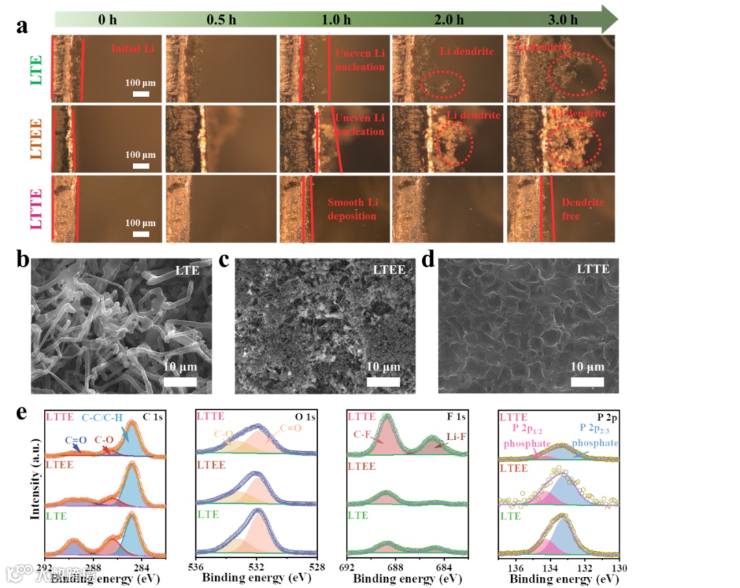 图5. Li+镀/剥离过程中的形态特征:(a)原位光学显微镜图像显示了在1 mA cm−2下使用不同电解液在对称电池中镀/剥离Li电极时的横截面。在(b)LTE(c)LTEE和(d)LTTE中,电流密度为1 mA cm−2,面积容量为1 mAh cm−2中,锂金属阳极在100次循环后的形态演变。(e)在各种电解液中循环50次后,对Li金属阳极的C 1s、O 1s、F 1s和P 2p进行XPS分析。