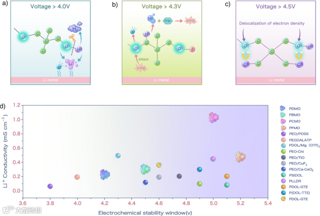图1. 高电压条件下聚醚基电解质中的分子相互作用示意图。a) 聚醚基电解质在高于4V截止电压下的降解机理。b) 聚醚基电解质在高于4.3V截止电压下的降解机理。c) 用于增强聚醚基电解质氧化稳定性的卤化策略机理。d) 本文所述的卤化聚醚基电解质与文献报道的其他聚醚基电解质在离子电导率和电化学稳定窗口方面的性能比较。
