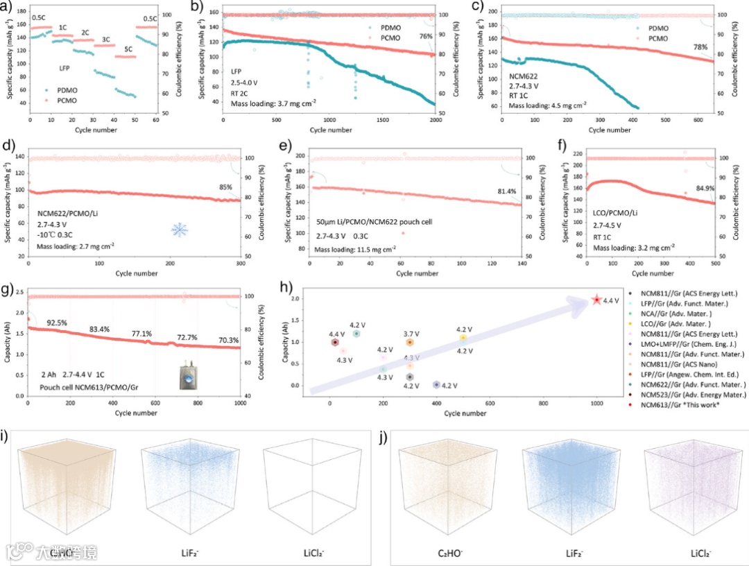图6. 全电池的电化学性能与表面分析。a) LFP/PDMO/Li 和 LFP/PCMO/Li 电池的倍率性能。b) 使用PDMO和PCMO的LFP//Li全电池在2 C倍率下的循环性能。c) 使用PDMO和PCMO的NCM622//Li全电池在1 C倍率下的循环性能。d) NCM622/PCMO/Li电池在-10 °C下的循环性能。e) NCM622/PCMO/Li软包电池在0.3 C下的循环性能。f) LCO/PCMO/Li电池在1 C倍率、3–4.5 V电压范围内的循环性能。g) NCM613/PCMO/Gr(石墨)2 Ah软包电池在1 C下的性能。h) 石墨负极电池的性能对比。相关参考文献见表S1。i) 和 j) 分别使用PDMO和PCMO的电池在循环后,其正极表面的ToF-SIMS深度剖面分析。