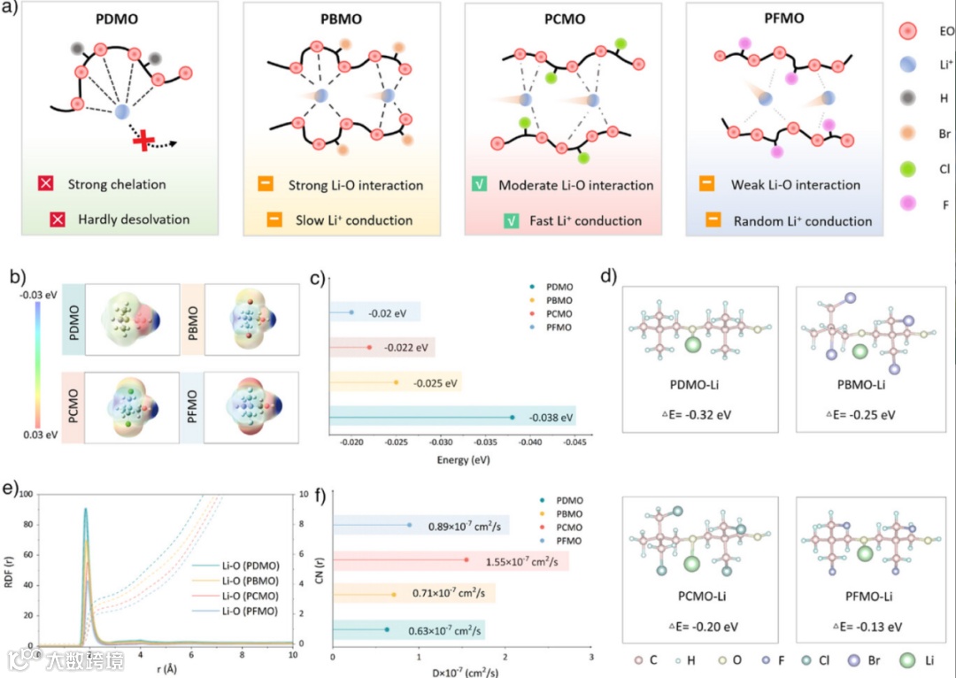 图2. 卤化策略对聚醚基电解质中Li⁺传输影响的机理分析a) 聚醚基电解质中Li⁺配位与电导率的示意图。分子层面描绘了在PDMO、PBMO、PCMO和PFMO中Li⁺与醚氧单元的相互作用,重点突出了配位强度和离子传输行为。b) PDMO、PBMO、PCMO和PFMO中聚合物链段的静电势密度分布。c) 计算得出的PDMO、PBMO、PCMO和PFMO中醚氧原子的静电势值。d) Li⁺与PDMO、PBMO、PCMO和PFMO重复单元配位的优化结构及其相应的结合能(ΔE)。e) 计算得出的PDMO、PBMO、PCMO和PFMO中Li─O的径向分布函数g(r)和配位数(CNs)。f) 计算得出的PDMO、PBMO、PCMO和PFMO中的Li⁺扩散系数。