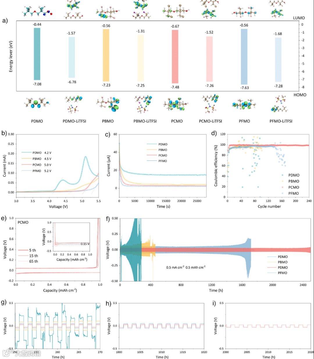 图4. 聚醚基电解质的稳定性与电化学性能研究。a) 计算所得的聚合物电解质(PDMO、PBMO、PCMO、PFMO)及其与LiTFSI复合物的HOMO和LUMO能级。b) PDMO、PBMO、PCMO和PFMO的LSV曲线。c) PDMO、PBMO、PCMO和PFMO在4.5 V恒定电压下的计时电流法曲线。d) 使用不同电解质的Li//Cu电池中,锂电镀/剥离的库伦效率。e) 使用PCMO的Li//Cu电池的电压曲线。插图为首次循环的电压曲线,用于评估锂的成核过电势。f) 使用不同电解质的Li//Li对称电池在0.5 mA cm⁻²电流密度和0.5 mAh cm⁻²容量下的长循环性能。g), h), i) 图4f中电压曲线的放大图,分别展示了在 g) 250–270小时, h) 1000–1020小时, 以及 i) 2000–2020小时期间的过电势演变情况。