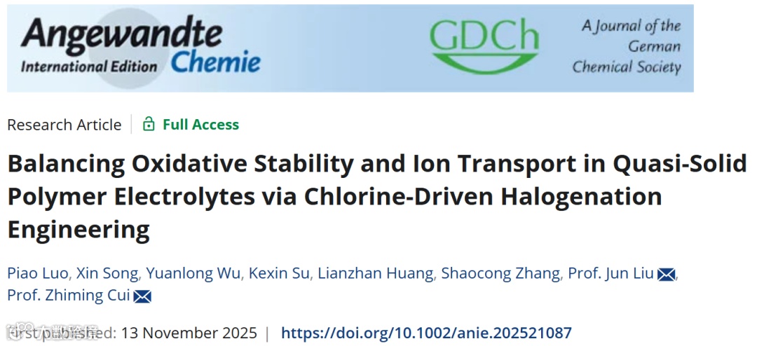 近日,来自华南理工大学的崔志明教授与刘军教授团队在国际顶级期刊 Angewandte Chemie International Edition 上发表重要研究成果“Balancing Oxidative Stability and Ion Transport in Quasi-Solid Polymer Electrolytes via Chlorine-Driven Halogenation Engineering”。团队提出了一种新颖的氯驱动卤化工程策略,通过精确调控聚醚骨架中醚氧原子的电子环境,巧妙地解决了氧化稳定性与离子传输速率之间的矛盾。研究发现,氯(-Cl)元素具有最均衡的吸电子效应,该策略不仅有效抑制了导致电解质分解的副反应,还将电化学稳定窗口拓宽至5.0 V,同时实现了高达1.14 mS cm⁻¹的优异离子电导率。基于该策略开发的氯化聚醚电解质(PCMO)在多种电池体系中表现卓越,尤其在2 Ah软包电池中,于4.4 V高电压下稳定循环超过1000次,展现了巨大的商业化应用潜力。
