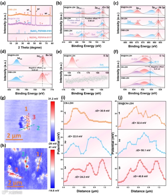 图2:(a) XRD谱图;(b) Co 2p XPS光谱;(c) Ni 2p XPS光谱;(d) Ba 3d XPS光谱;(e) S 2p XPS光谱;(f) O 1s XPS光谱;(g)和(h) SKPM图像;(i)和(j) 表面电位。