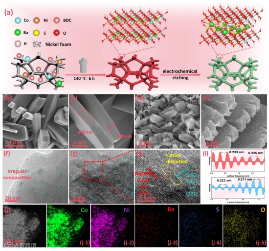 图1:(a) BS@CN-LDH电极制备工艺流程图;(b)和(c) CNB-BDC的SEM图像;(d)和(e) BS@CN-LDH的SEM图像;(f) BS@CN-LDH的TEM图像;(g)和(h) BS@CN-LDH的HRTEM图像;(i) Ni(OH)2与BaSO4非均相界面的界面晶格畸变图;(j) BS@CN-LDH的TEMTEM-Mapping图像。
