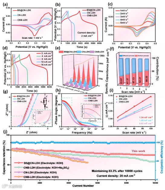 图4:BS@CN-LDH、CN-LDH和CNB-LDH的电化学性能:(a) 1 mV s-1时的CV曲线;(b) 2 mA cm-2时的GCD曲线;(c)和(d)分别为BS@CN-LDH的CV和GCD曲线;(e) 比容量与电流密度的线性关系;(f) 不同扫描速率下BS@CN-LDH样品表面控制过程和扩散控制过程的电容贡献率;(g) Niquist阻抗曲线;(h) 波德相角图;(i) ∆j与扫速的线性拟合曲线;(j) 在电流密度为20 mA cm-2时的循环性能。