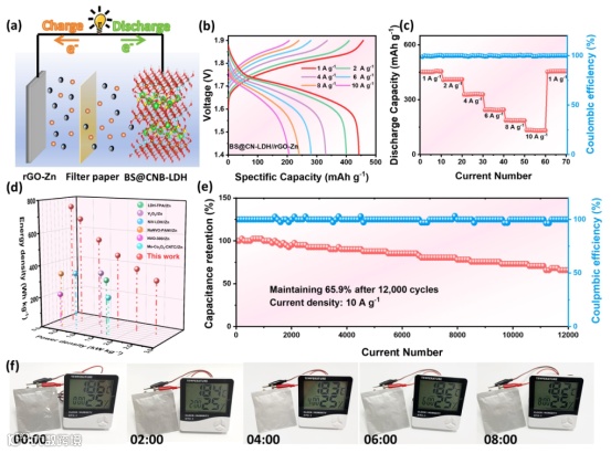图5:(a) BS@CN-LDH//rGO-Zn AAZB装置原理图;(b) BS@CN-LDH//rGO-Zn器件在不同电流密度下的GCD曲线;(c) 1~10 A g-1在不同电流密度下的速率性能和可逆性;(d) 拉贡图阐明了能量密度和功率密度之间的基本关系;(e) BS@CN-LDH//rGO-Zn器件在10 A g-1电流密度下的循环稳定性;(f) BS@CN-LDH//rGO-Zn软包装置。