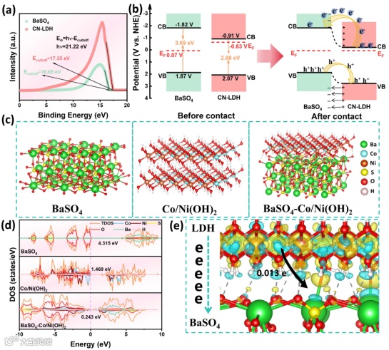 图3:(a) UPS光谱;(b) 能带结构模型;(c) 原子几何模型;(d) DOS;(e) 界面电荷密度差图。