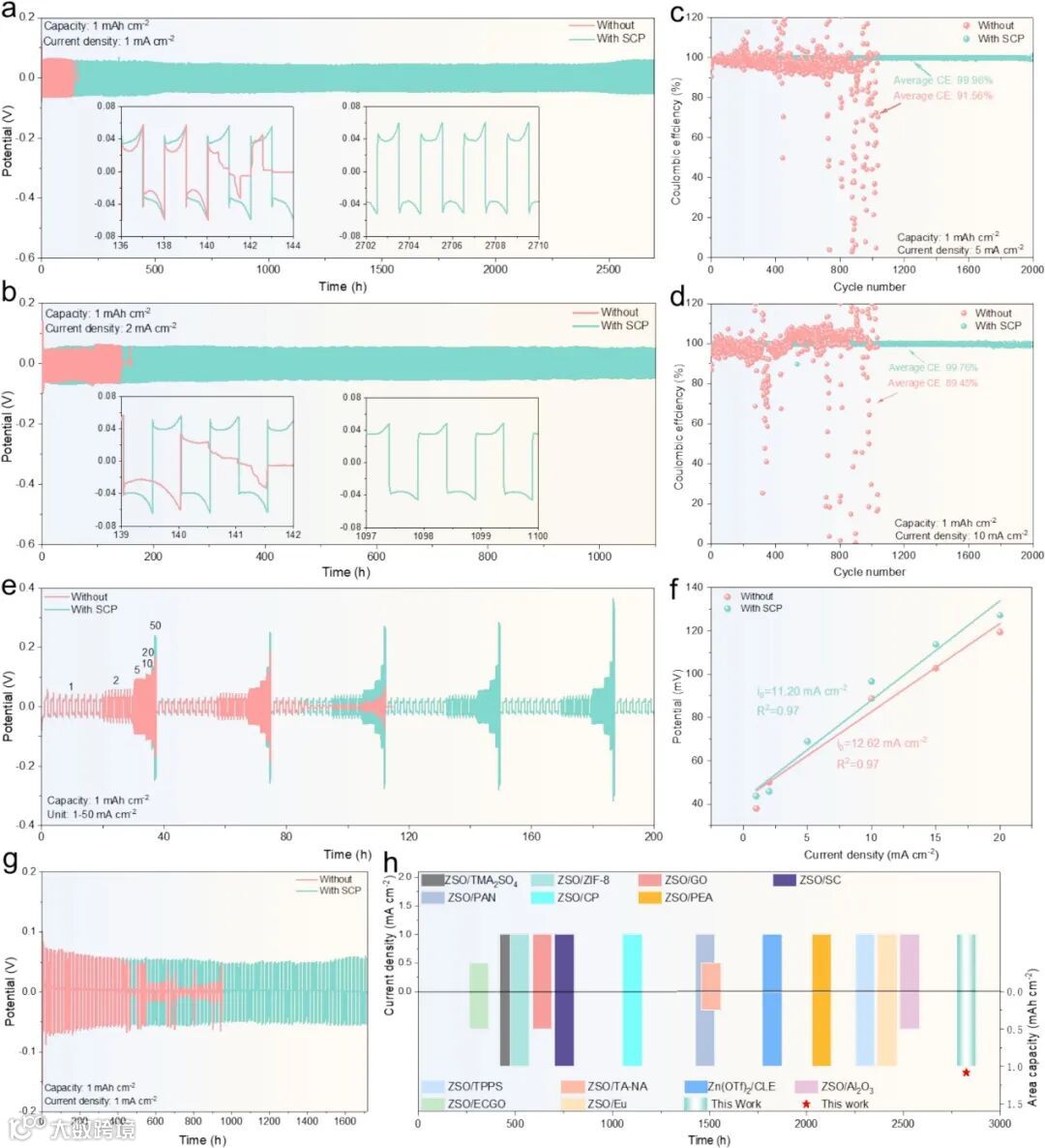 图3. SCP/ZnSO4电解质界面电场缺陷修复工程对半电池电化学性能的影响