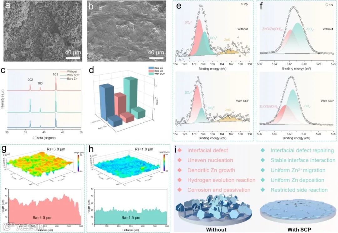 图4. SCP/ZnSO4电解质界面电场缺陷修复工程对循环后Zn阳极的影响