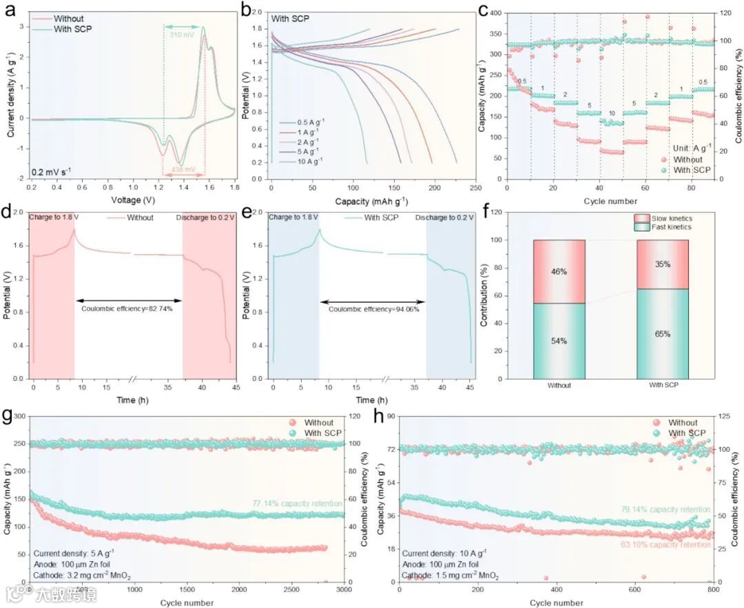 图6. SCP/ZnSO4电解质对Zn//MnO2全电池的电化学性能的影响