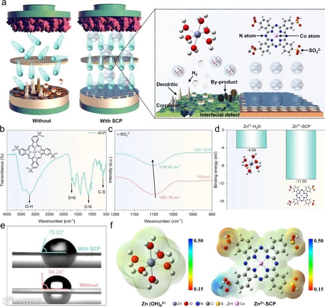 图1. SCP/ZnSO4电解质的保护机制和溶剂化结构分析