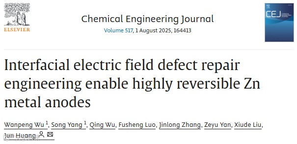 该成果以题为"Interfacial electric field defect repair engineering enable highly reversible Zn metal anodes"在SCI一区Top期刊Chemical Engineering Journal上发表。贵州大学本科生吴万鹏、硕士研究生杨宋为本文共同第一作者,通讯作者为贵州大学黄俊特聘教授。