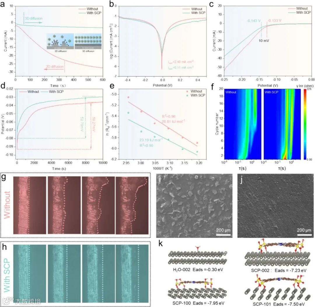 图2. SCP/ZnSO4电解质提高迁移动力学和耐腐蚀性。