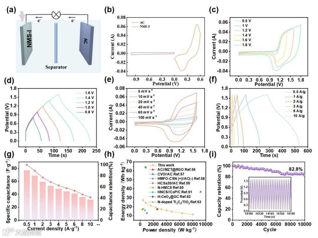 图4. NMS-I//AC混合超级电容器的电化学特性,(a)两电极配置示意图,(b)NMS-I和AC在三电极中以10 mV s–1的CV曲线,(c)NMS-I//AC在不同电压范围内的CV曲线(30 mV s–1),(d)1 A g–1的GCD曲线,(e)不同扫描速率下的CV曲线,(f)不同电流密度下的GCD曲线,(g)随着电流密度增加的电容演变,(h)Ragone图[56–63],(i)10 A g–1的循环稳定性。