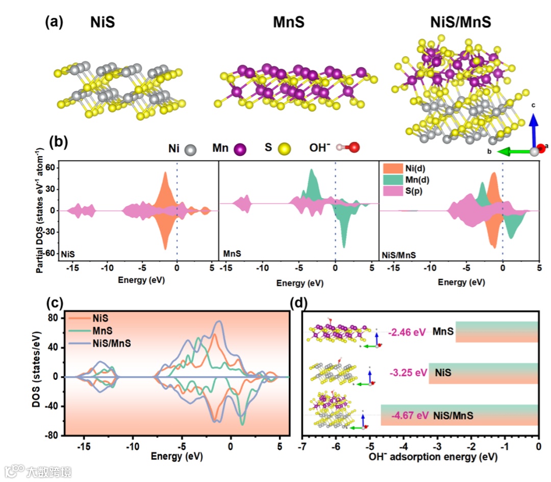 图2. (a) NiS, MnS和NiS/MnS的结构图和(b) PDOS和(c) 总DOS, (d) 原子模型及OHˉ的吸附能。