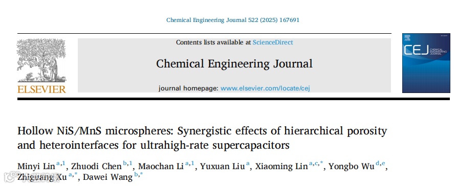 近日,华南师范大学林晓明教授与中山大学王大为副教授合作,在国际知名期刊Chemical Engineering Journal上发表题为“ Hollow NiS/MnS microspheres: synergistic effects of hierarchical porosity and heterointerfaces for ultrahigh-rate supercapacitors”的观点文章。该研究通过溶剂热法成功制备了具有层级多孔结构的空心NiS/MnS纳米复合材料,系统比较了三种不同有机配体(异烟酸INA、均苯四酸PMA和均苯三酸BTC)合成的材料性能。过密度泛函理论计算,研究团队揭示了NiS/MnS异质界面增强电子导电性和促进离子传输的机制,证实了多孔结构和异质界面协同效应对提升电化学性能的重要性。