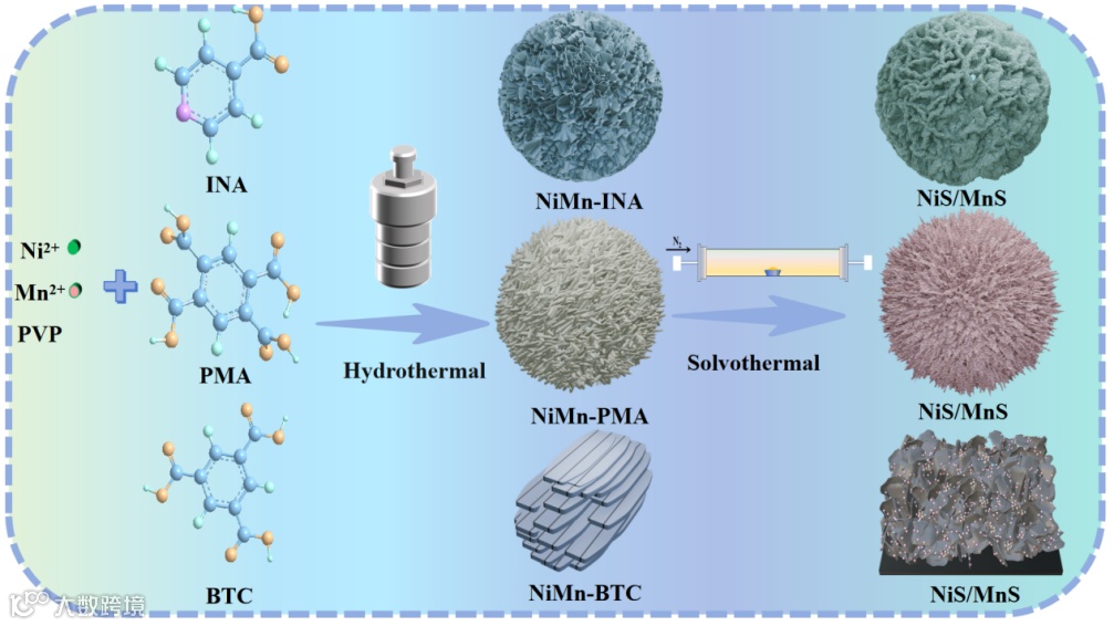 图1. 不同配体制备的NiS/MnS复合材料的合成路线。