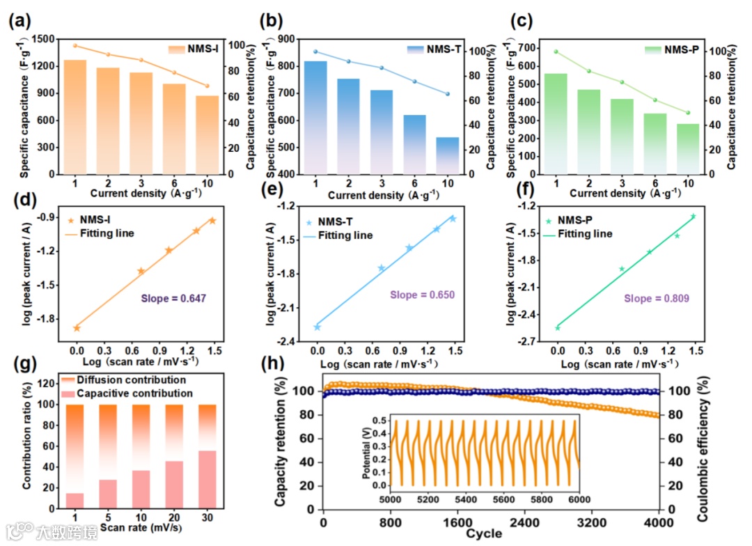 图3.(a-c)NMS-I、NMS-T和NMS-P在不同电流密度下的电容保持率,(d-f)NMS-I、NMS-T和NMS-P的峰值相关电容机制的Log(i)-log(v)图,(g)NMS-I中电容和扩散电荷存储的贡献,(h)NMS-I在10 A g–1下的循环稳定性(插图显示循环期间的GCD曲线)。