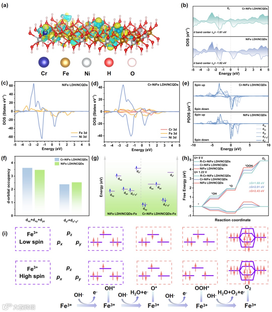 Figure 6. Theoretical structural models of charge density (a). Density of states of samples (b). PDOS of Fe 3d and Ni 3d in NiFe LDH/NCQDs (c) and Cr-NiFe LDH/NCQDs (d). Calculated spin-resolved PDOS of Cr-NiFe LDH/NCQDs and NiFe LDH/NCQDs (e). The corresponding d-orbital occupancy (f). Fe 3d energy levels in Cr-NiFe LDH/NCQDs and NiFe LDH/NCQDs (g). Free energy step diagram of the OER process (h). The illustration of the orbital interaction of the metal active sites with OER intermediates (i).
