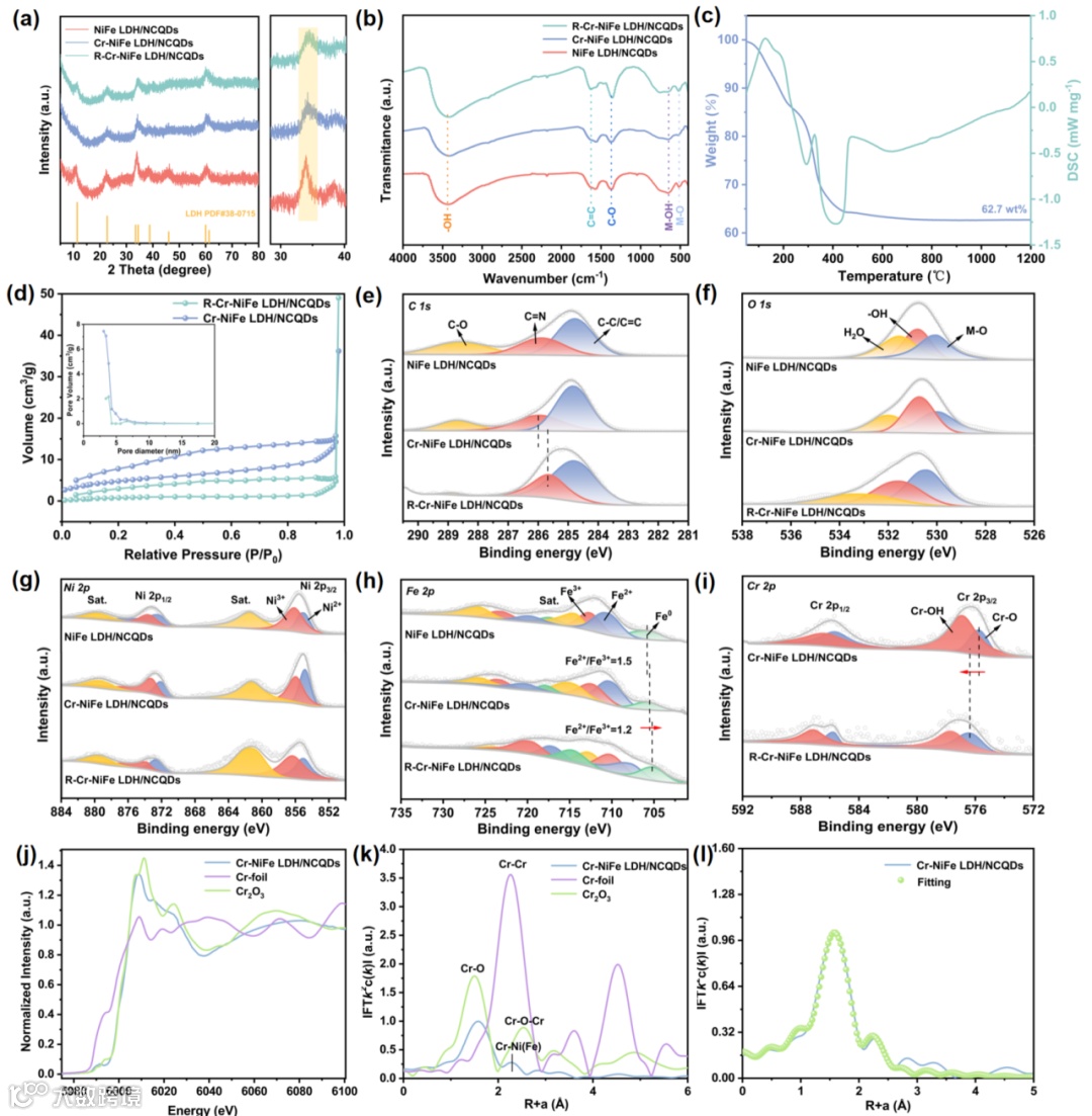 Figure 2. XRD patterns (a) and FTIR spectra (b) of different samples. TG and DSC spectra for Cr-NiFe LDH/NCQDs (c). Nitrogen adsorption-desorption isotherms for different samples (d). XPS spectra of R-Cr-NiFe LDH/NCQDs, Cr-NiFe LDH/NCQDs and NiFe LDH/NCQDs: C 1s (e), O 1s (f), Ni 2p (g), Fe 2p (h), Cr 2p (i). Cr K-edge XANES spectra for Cr-foil, Cr2O3, Cr-NiFe LDH/NCQDs j). FT k3-weighted Cr K-edge EXAFS in R-space for Cr-foil, Cr2O3, Cr-NiFe LDH/NCQDs k). Cr K-edge FT-EXAFS fitting spectrum at R space of Cr-NiFe LDH/NCQDs l).