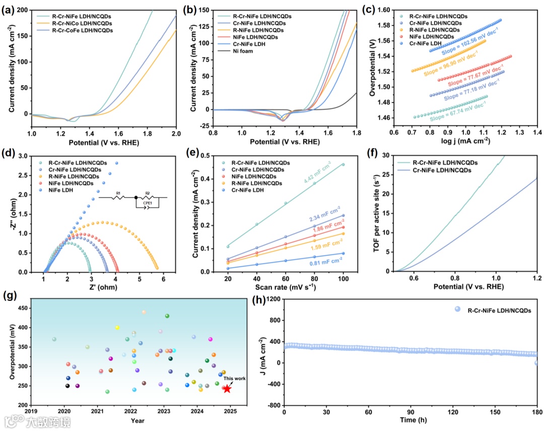 Figure 3. LSV curves of samples (a-b). Tafel plots of samples (c). EIS of samples (d). Double‐layer capacitance Cdl of samples (e). TOF curves of samples (f). The OER overpotential comparison of other samples at 10 mA cm-2 (g). The chronovoltammogram of R-Cr-NiFe LDH/NCQDs during OER processes (h).