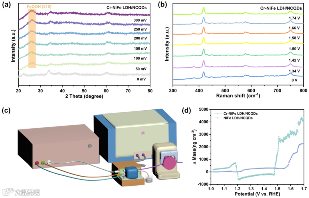 Figure 4. In-situ XRD patterns of Cr-NiFe LDH/NCQDs at various potentials and corresponding contour plot for the 0-300 mV potential range (a). In situ Raman spectra of Cr-NiFe LDH/NCQDs at different potentials and corresponding contour plot for 0-1.74 mV potential range (b). Schematic of EQCM setup (c). The mass change of Cr-NiFe LDH/NCQDs and NiFe LDH/NCQDs during LSV testing (d).