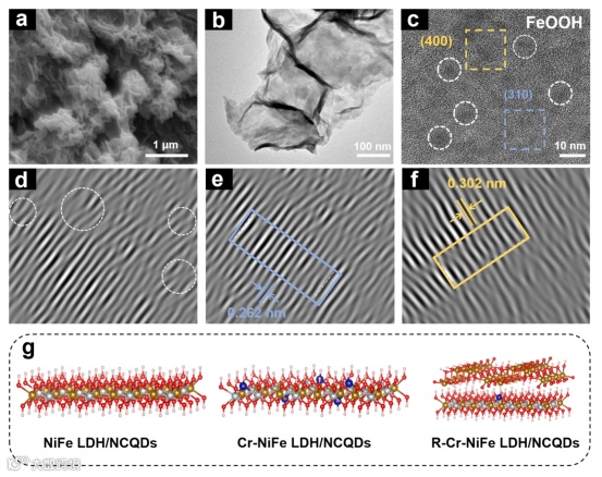 Figure 5. SEM (a), TEM (b), HRTEM (c-d) and FFT images of R-Cr-NiFe LDH/NCQDs (e, f). Structure representations of NiFe LDH/NCQDs, Cr-NiFe LDH/NCQDs and R-Cr-NiFe LDH/NCQDs (g).