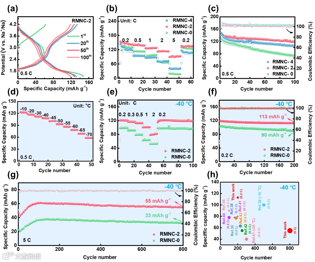 Figure 2. Electrochemical properties at 25 °C: a) GCD profiles of RMNC-2 at 0.5 C. b) Rate performance of RMNC-0, RMNC-2 and RMNC-4. c) Cycling performance of RMNC-0, RMNC-2 and RMNC-4 at 0.5 C. d) Cycling performances of RMNC-0 and RMNC-2 at 0.5 C from −10 to −70 °C. Electrochemical properties at −40 °C: e) Rate performances of RMNC-0 and RMNC-2. Cycling performances of RMNC-0 and RMNC-2 at f) 0.2 C and g) 5 C. h) Comparison of the electrochemical performance of RMNC-2 with other recently reported cathodes for SIBs at −40 °C (materials not tested at −40 °C are marked accordingly).