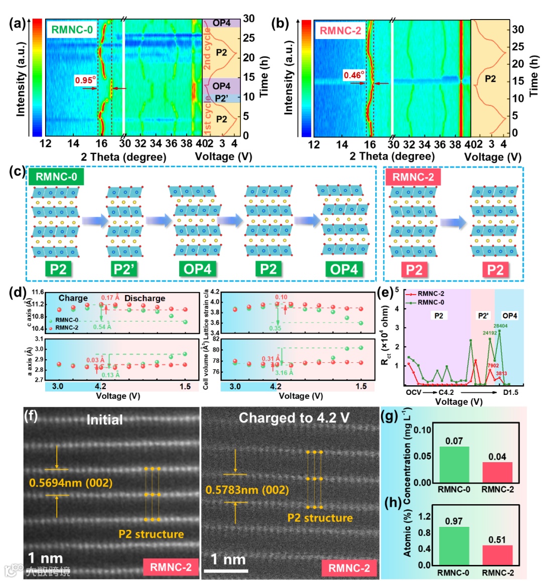 Figure 3. In-situ XRD patterns of a) RMNC-0 and b) RMNC-2 electrodes at different voltage states (1.5–4.2 V) at 0.1 C. c) Crystal structure evolution of RMNC-0 and RMNC-2. d) Evolution of lattice parameters obtained by rietveld refinement. e) In-situ EIS spectra of RMNC-2 and RMNC-0 at different voltages (-40°C). f) STEM–HAADF images of RMNC-2 electrodes in their uncycled state and after multiple cycles, recharged to 4.2 V. g) ICP results showing Mn ion dissolution after 200 cycles at 2 C for RMNC-0 and RMNC-2. h) Mn atomic ratio on the surface of sodium metal after 200 cycles at 2 C.