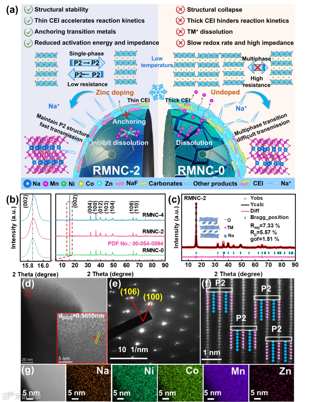 Zn离子的引入诱导形成薄而富含NaF的CEI膜,该界面层具有优异的电绝缘性和机械强度,能有效抵抗电极材料破裂(缓解应力)并抑制电解液分解。优化再生正极结构中过渡金属与氧的轨道杂化,有效降低CEI界面阻抗(RCEI)和反应活化能,显著提升钠离子在常温和低温环境下的存储速率。