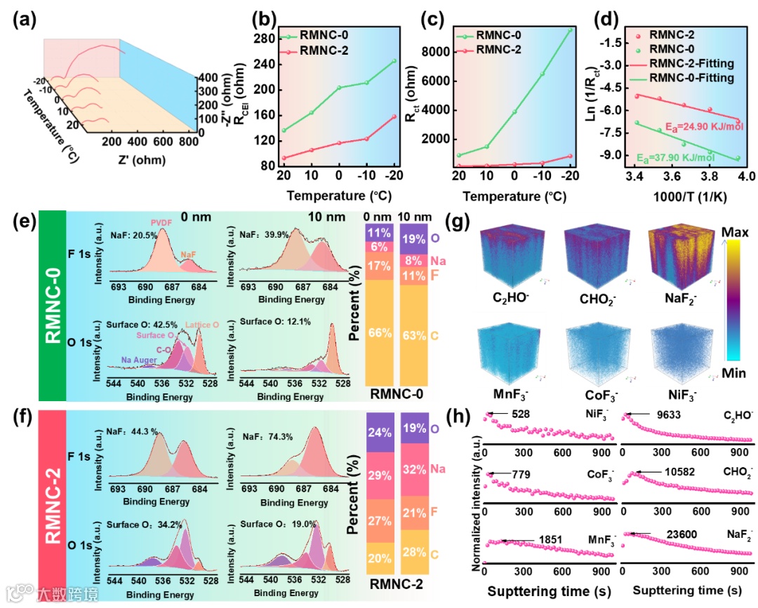 Figure 4. a) EIS study of RMNC-2 at various temperatures. Evolution of b) RCEI and c) Rct in different temperatures for RMNC-0 and RMNC-2 electrolytes. d) Calculated activation energy for RMNC-0 and RMNC-2. Comparison of the F 1s and O 1s XPS spectra of e) RMNC-0 and f) RMNC-2. g) Three-dimensional reconstructed images of the CEI for RMNC-2, showing the signals of C2HO−, CHO2−, NaF2−, NiF3−, MnF3− and CoF3− species. h) TOF-SIMS depth profiles of NiF3−, MnF3−, CoF3−, C2HO−, CHO2− and NaF2− species in RMNC-2.
