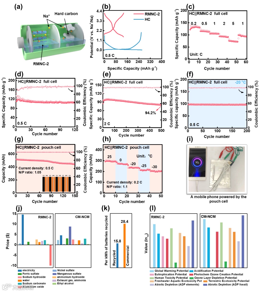 Figure 6. The performance of the full cell consisting of RMNC-2 and HC: a) Schematic diagram illustrating the operational principle of the HC || RMNC-2 full cell. b) GCD curves for RMNC-2 and hard carbon in a half-cell configuration. c) Rate performance of the HC || RMNC-2 full cell. Cycling stability of the HC || RMNC-2 full cell at d) 0.5 C and e) 2 C. f) Electrochemical energy storage performance of HC || RMNC-2 full cell at −20 °C. g) Cycling performance of HC || RMNC-2 pouch cell at 0.5 C. h) Performance of HC || RMNC-2 pouch cell under different temperatures from 25 to −30 °C during cycling at 0.2 C. i) Schematic diagram of HC || RMNC-2 pouch cell powered a mobile phone. Analysis of economic and environmental effects of synthetic regenerated RMNC-2 and commercial cathode (CM-NCM). j) Life cycle cost of each part. k) Total life cycle cost. l) Environmental impact characterization results.