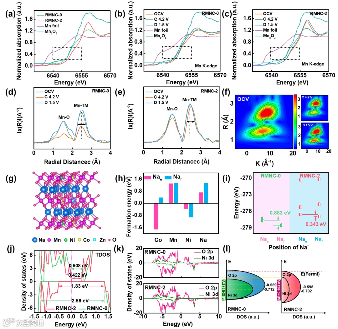 Figure 5. Coordination environment characterization of RMNC-0 and RMNC-2: a) Mn normalized K-edge XANES spectra; b, c) Mn normalized K-edge XANES spectra and d, e) Mn EXAFS analysis of the samples at different voltages during the first cycle. f) WT-EXAFS spectra of RMNC-2 at different voltages. g) Crystal structure of RMNC-2 doped with Zn at the Ni site. h) Doping formation energies for Zn substitution at Co, Mn, Ni and Na sites. i) Energy difference between Nae and Naf sites in RMNC-0 and RMNC-2. j) TDOS for RMNC-2 and RMNC-0 (Local). k) DOS of O 2p and Ni 3d orbitals for RMNC-0 and RMNC-2. l) Schematic representation of the DOS for RMNC-0 and RMNC-2.
