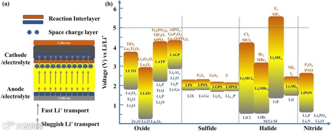 图 3:(a)在正极/ISEs和Li/ISEs中存在SCL和界面反应层;(B)理论计算ISEs的电化学稳定窗口和对应的分解产物