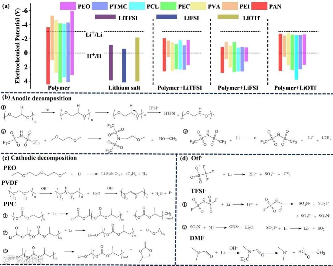 图7 (a) DFT计算聚合物和锂盐的电化学电位;(b) PEO的氧化分解路径;(c) PEO、PVDF和PPC的还原分解路径;(d) 锂盐OTf-、TFSI-和溶剂DMF的还原分解