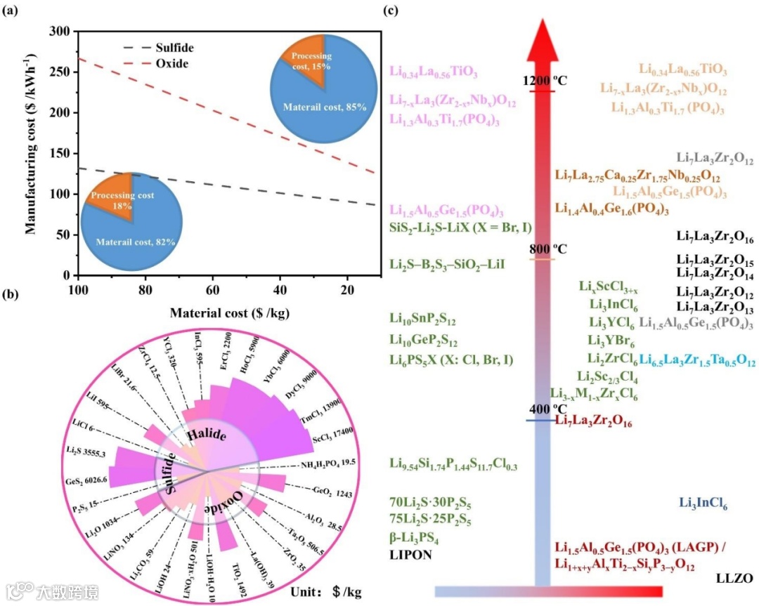 图2.(a)基于双极堆叠配置和年产量为6 GWh条件下的硫化物和氧化物的成本;(b)无机固态电解质原材料价格预测;(c)各种方法加工ISEs所需的温度