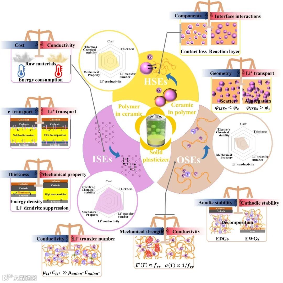 离子电导率和锂离子迁移数是电解质的重要参数,前者反应电解质中离子传输速率,后者反应锂离子在离子传输中的占比。OSEs较低的锂离子迁移数导致极化和锂枝晶形成。从聚阴离子,阴离子受体和阴离子接枝框架材料说明提高锂离子迁移数伴随着锂离子电导率的降低,有效的“平衡”解决方案亟待提出。